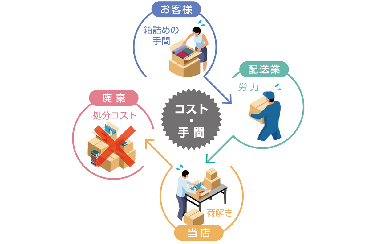 お客様が一生懸命に箱詰め及び発送し、配送業者様が運び、当社でもそれを荷解き及び査定するなど、様々な人的コストを要するにもかかわらず、最終的には値段も付かず本は廃棄される。