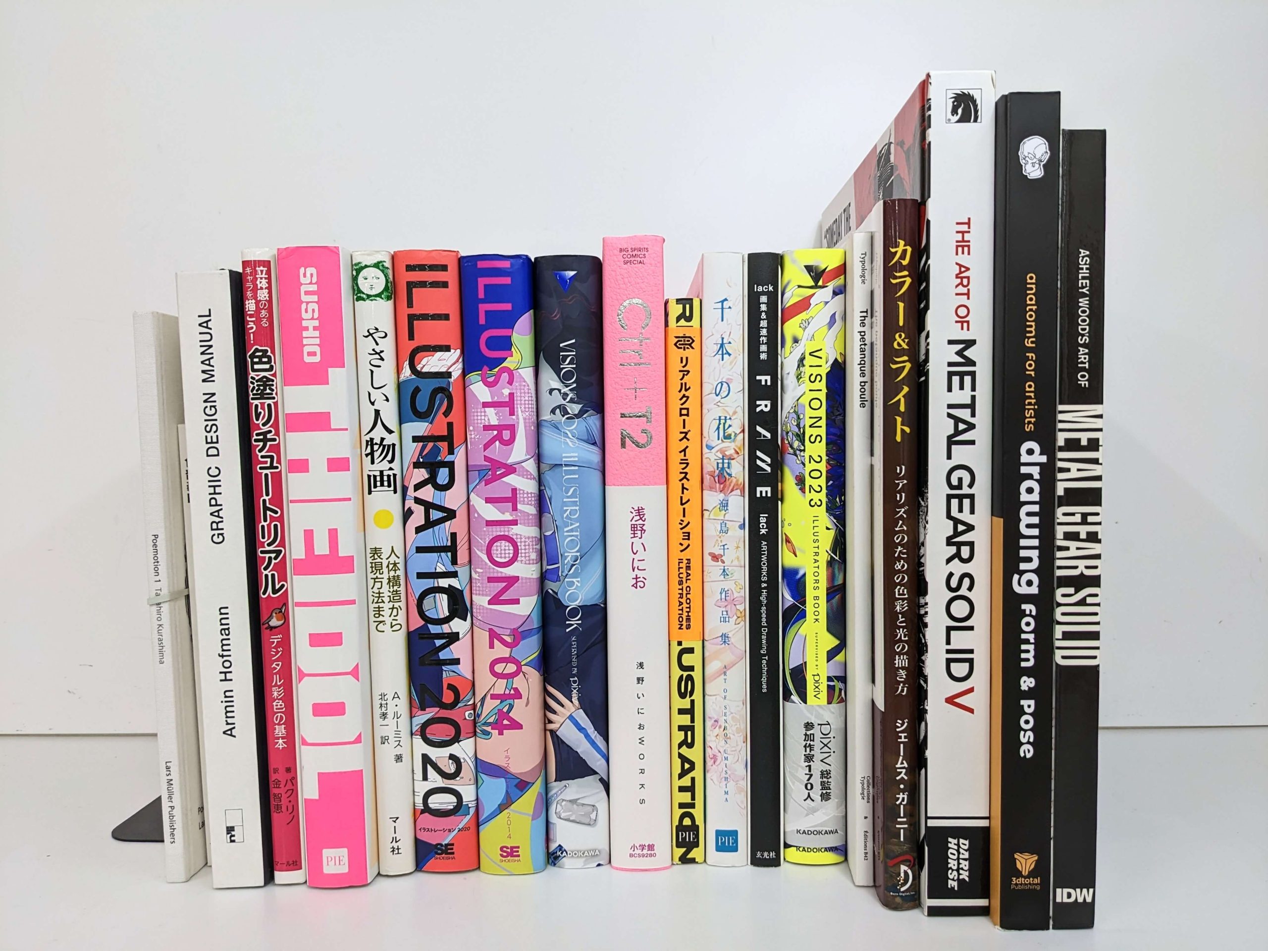 ↑左端に写っているのが上記のリストにもある「SUSHIO THE IDOL」です。アニメ制作会社トリガーに所属、人気アニメ「キルラキル」のキャラクターデザインはじめ、数多くのアニメ作品に参加している すしお氏のイラスト集です。アニメだけでなくアーティストのアルバムジャケットデザインも手掛けるなど、多方面でご活躍されています。