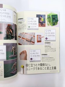 上の3点の写真は上記のリストには入っていないのですが、「月刊MdN 2018年8月号」(特集:SNSバズ百景 ――「RT」&「いいね」時代のクリエイション100)」より。デザインの世界、特に広告の世界ではSNSでバズることに注力した作品づくりが求められているのですね。誌面の作り方も見やすくてSNSっぽい雰囲気です。情報が視覚的に、直感的に入ってきやすいように工夫されています。こちらも思わず読み込んでしまいそうに…。当店もバズりたい(心の声)。