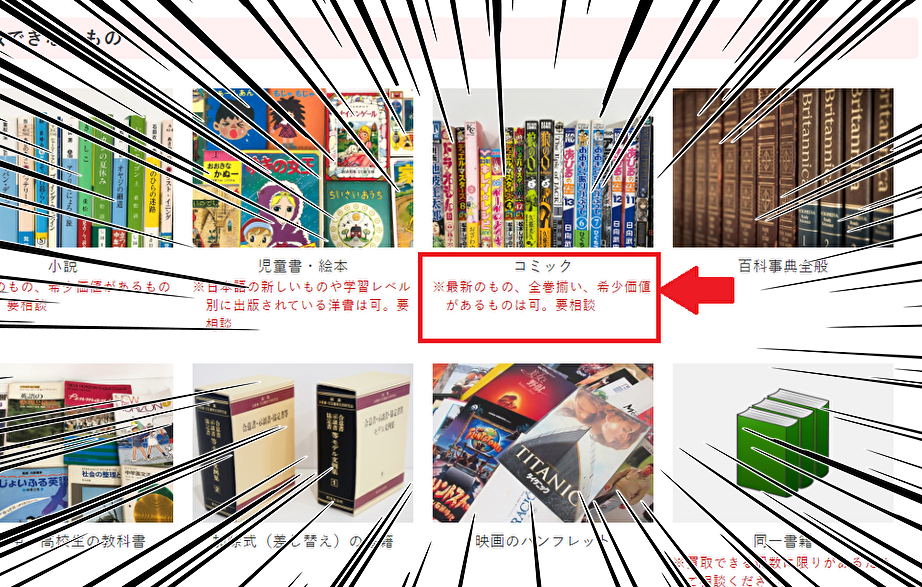 ところで、当店の常連のお客様の中には「あれ?」と思われた方もいらっしゃるかも知れません。そうです。当店では買取対象外のコミックが入っています。ただ、今回は全巻揃いだったため、需要を見込んでお値段付けさせていただいております。実は「買取できるもの・買取できないもの」をよくよく見ると…