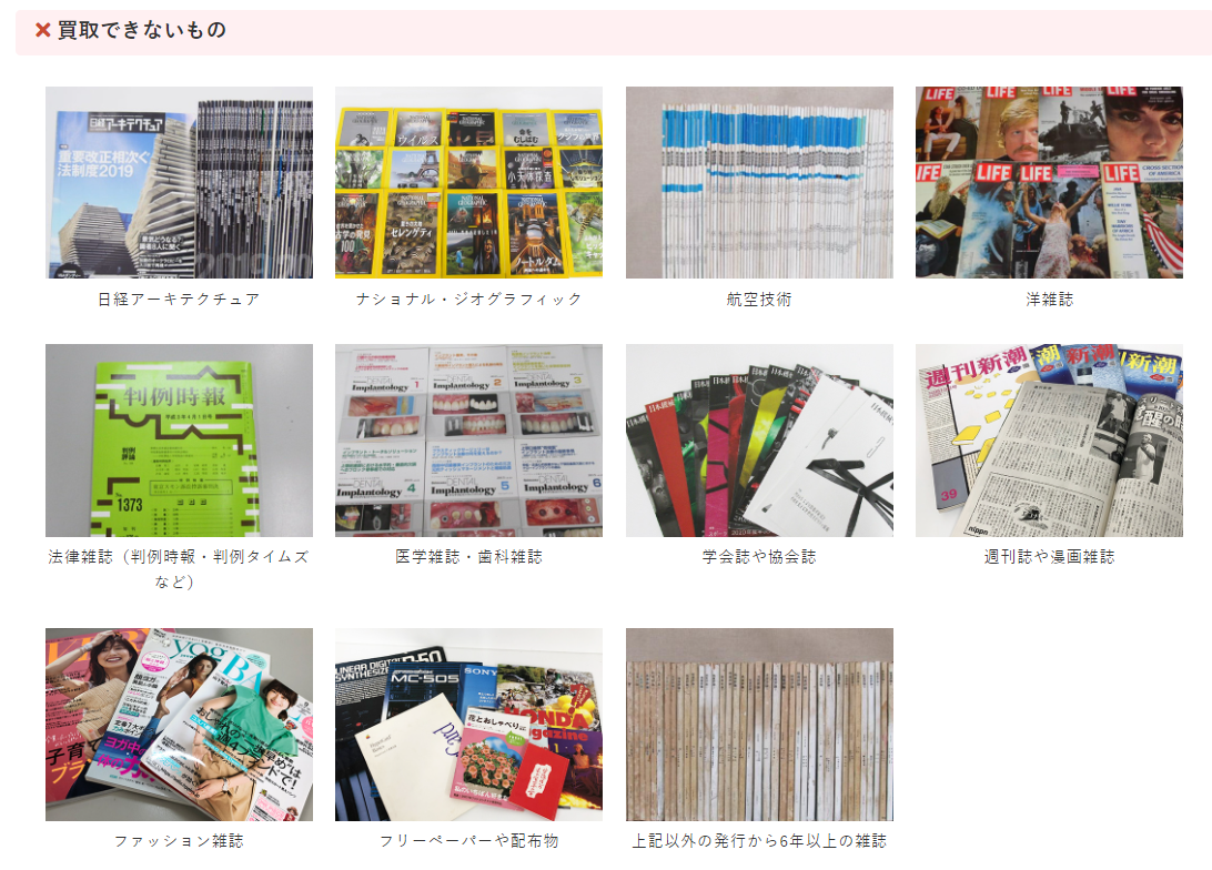 なお、雑誌の話題が出たついでに申し上げますと、以下のものについては新旧問わず買取対象外となりますのでご注意ください。