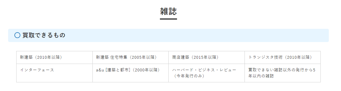 逆に言えば、上記の表に具体名が挙げられている雑誌で対象期間内のものは買取を歓迎しております。