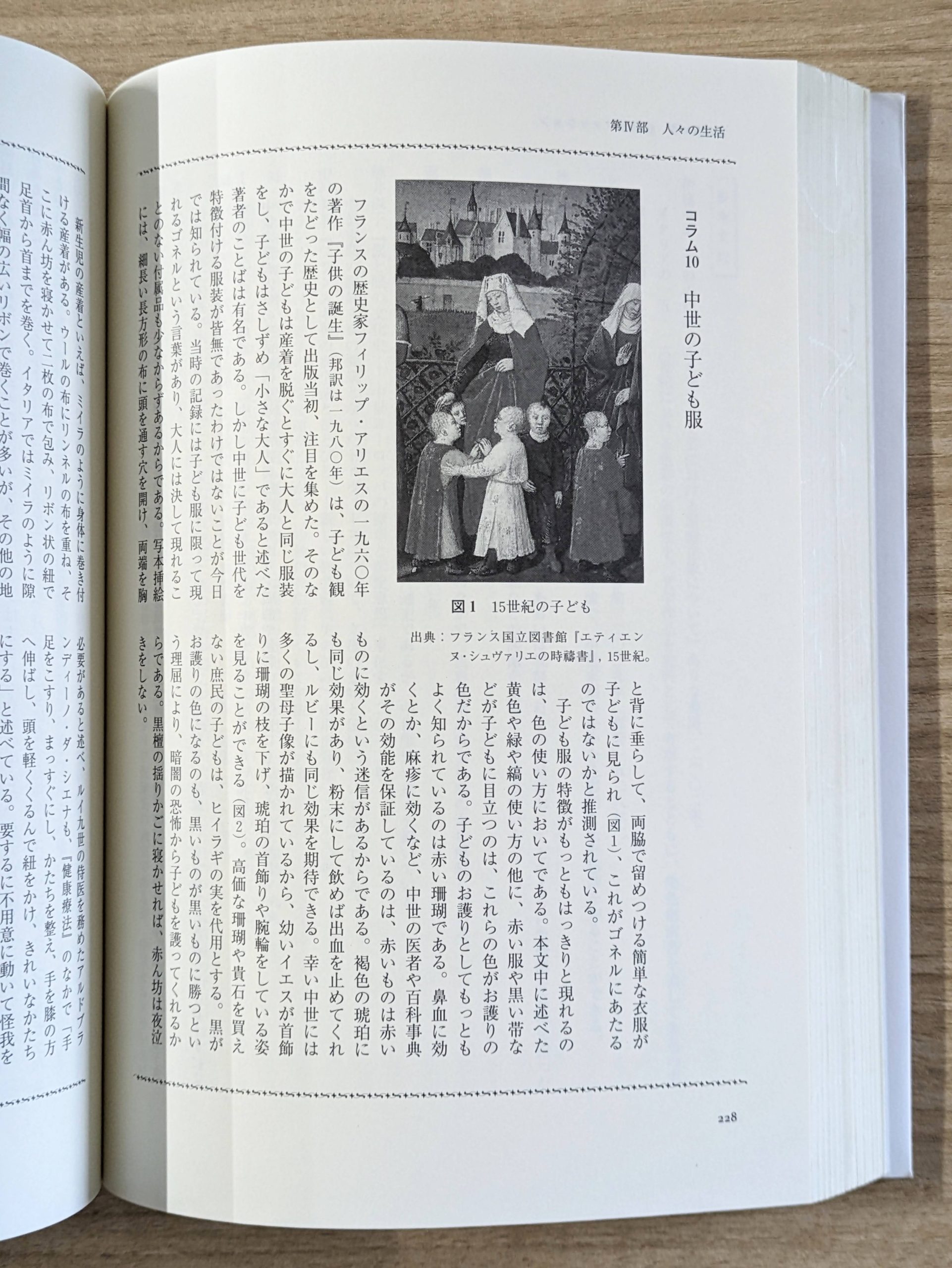 ②↑の写真はコラム10「中世の子ども服」より。かつて、中世における子どもは「小さな大人」だったと思われていましたが実は…。