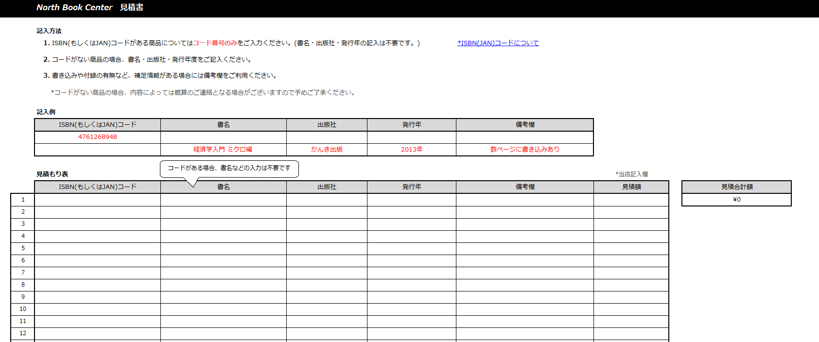 書籍の量が多い場合にはジャンプ先のページに用意しておりますエクセルファイルのテンプレートに書籍のISBN(もしくはJAN)コードがある商品についてはコード番号をハイフン抜きでご入力ください。