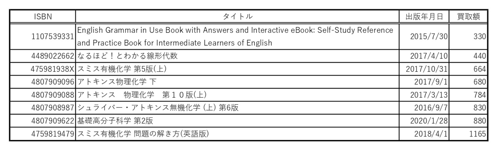 今回は有機化学や無機化学、物理学などの専門書や数学書などの理工系書籍を中心に、その他英語学習関連などの洋書を買取いたしました。
