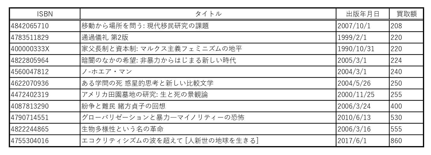 下表は今回の買取で1冊200円以上の買取額をつけさせていただいた本の一覧です。似たジャンルの蔵書のご売却をご検討中の方はご参考まで。ISBNのない本でも買取歓迎ですよ!