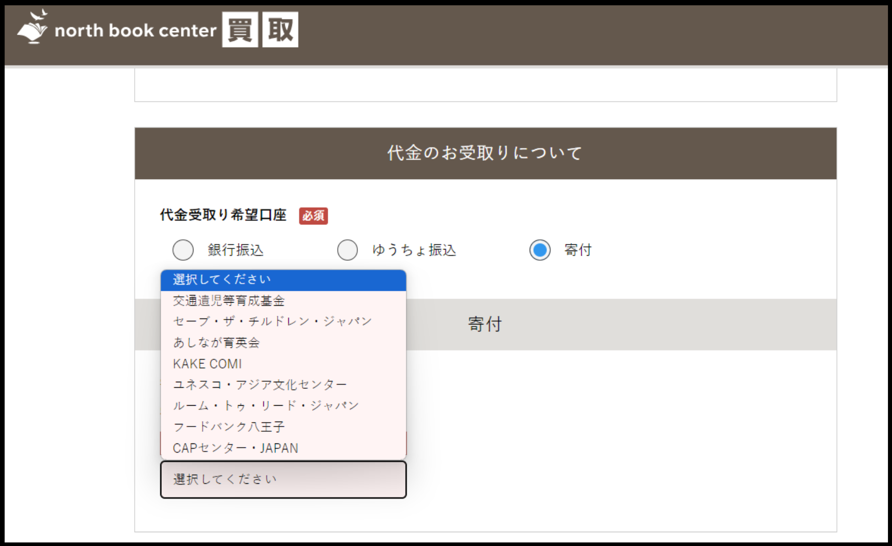 寄付買取でのご売却をご希望の方は、当店お申込みフォームからお進みいただき、「代金のお受け取りについて」の欄で「寄付」にチェック、その下の欄からご希望の寄付先をお選びください。