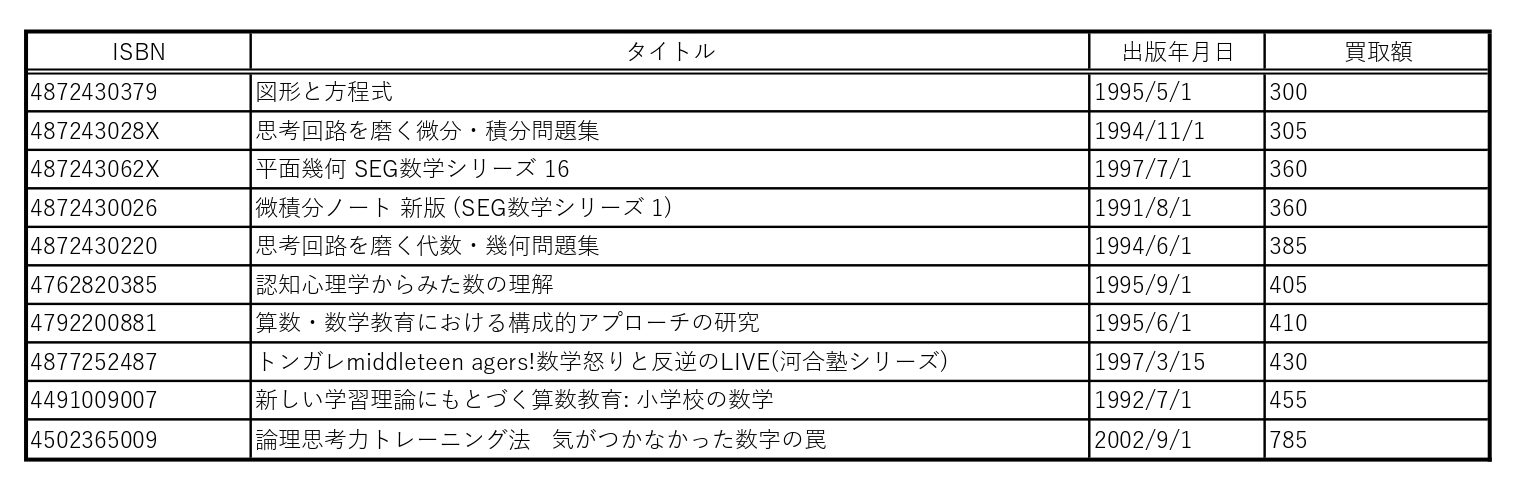 下表は今回の買取の中で300円以上の買取額がついたものの一覧となります。論理的思考トレーニングに関連した本や問題集のほか、認知心理学の立場から子どもがどのように数の概念を発達させていくかを論じた書籍なども数冊あり是非紹介したかったのですが、そちらもいつかまたの機会に…。