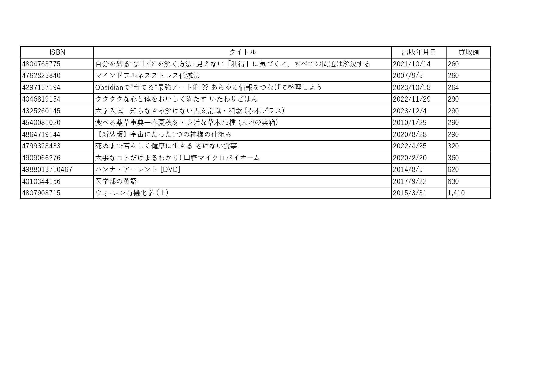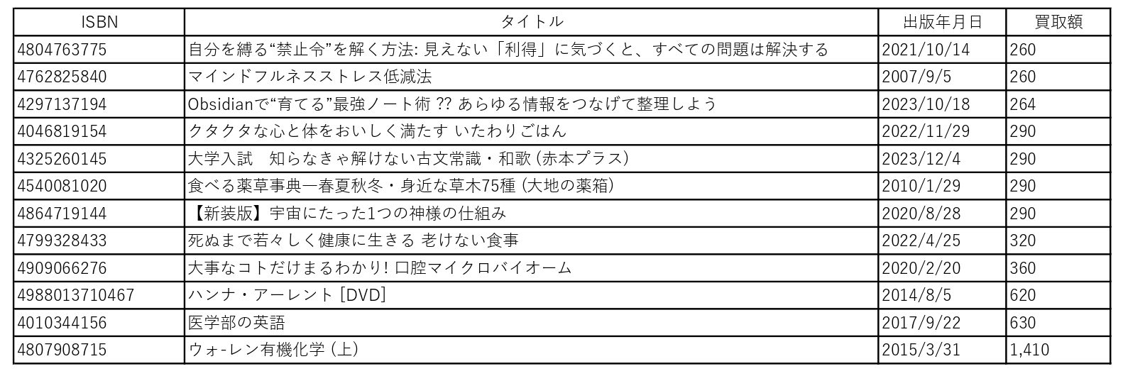 今回は250円以上の買取額が付いたものを一覧にしてあります。タイトルだけでも内容が気になるものが沢山あります。「死ぬまで若々しく健康に生きる 老けない食事」( ディスカヴァー・トゥエンティワン)とか。