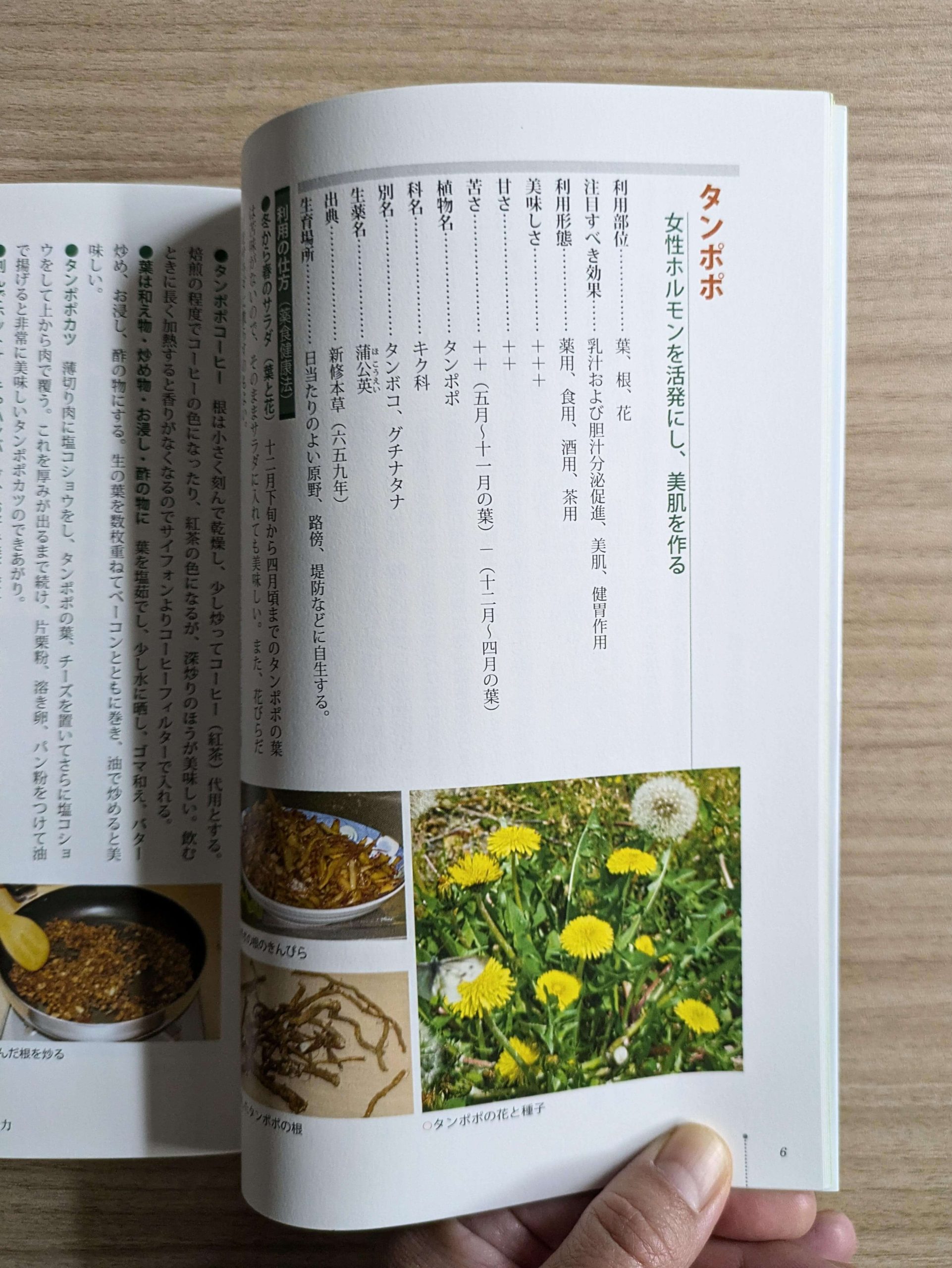 春におなじみの野草、タンポポ。タンポポコーヒーはわりとメジャーな利用方法ですが、炒めてよし、茹でてよし、和え物にしてよしと、意外な調理方法が沢山紹介されています。各薬草の「美味しさ」「甘さ」「苦さ」なども+や-で程度が表示されていて、味の想像がつきやすいところも親切。