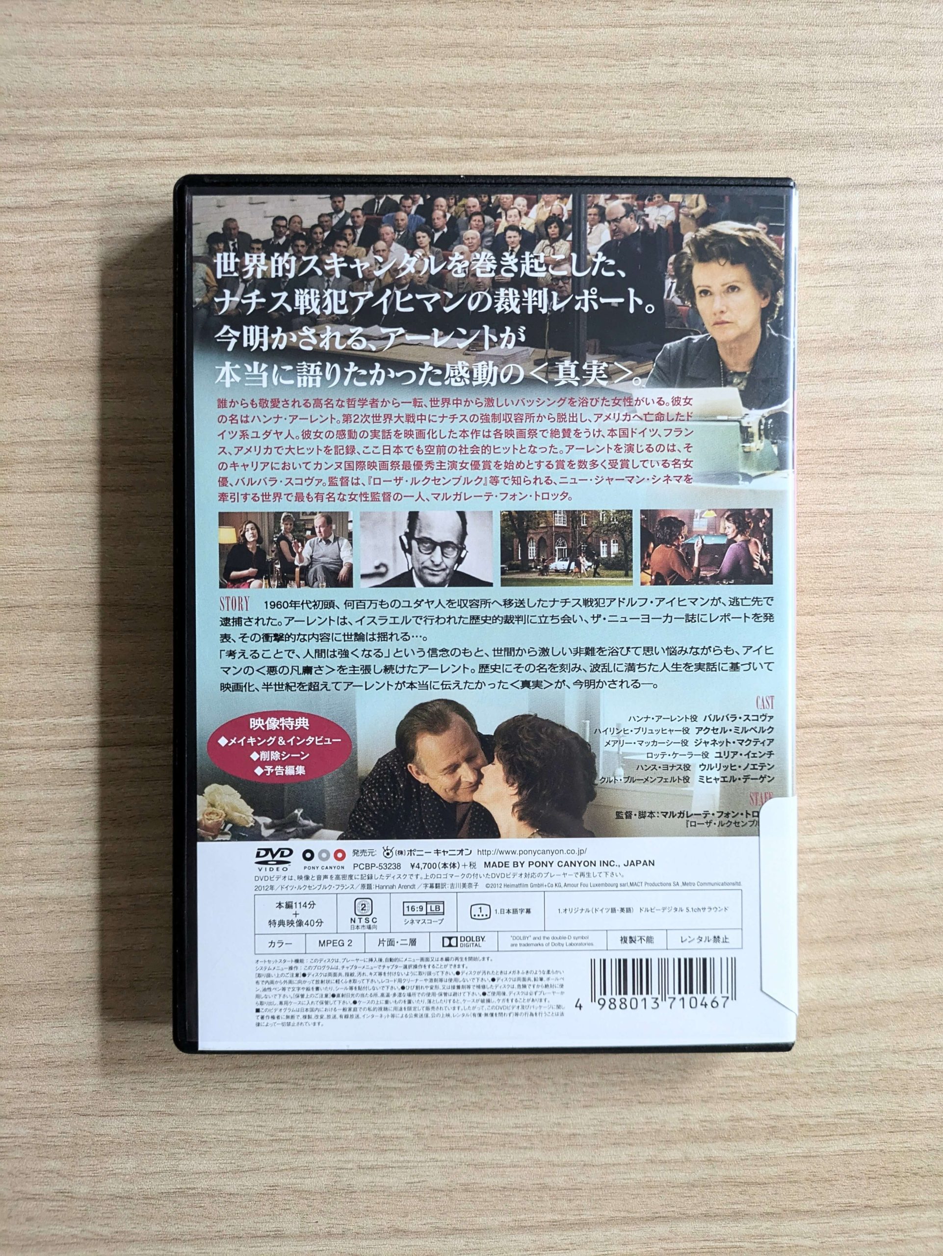 上の画像はDVDケースの裏側ですが、「今明かされる、アーレントが本当に語りたかった感動の<真実>。」という文字が踊ります。この「感動の<真実>」とやらが「恩師への恋心と未練なんですっ」というのではあまりに、それこそあまりに陳腐ではないでしょうか?世界的政治哲学者であるアーレントにも大変失礼です。この部分が以前の視聴時には非常に強く引っかかっていたのですね。
