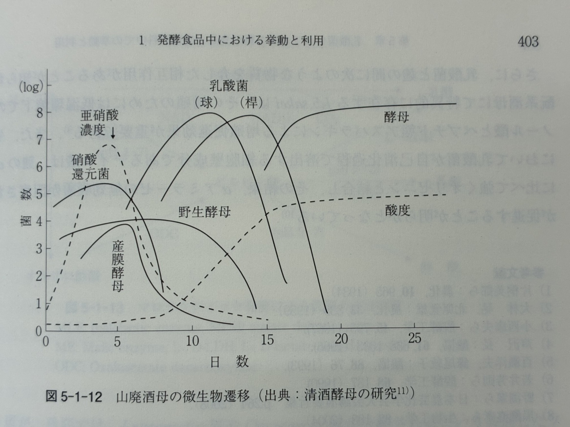 これらは乳酸菌のみで作られるものもあれば、酵母菌や麹菌などと協力するような形で発酵が進んでいくパターンもあります。例として清酒作りにおける微生物叢の遷移が下図の通り示されていますが、不要な細菌を抑制しながら複数の微生物が入れ替わるように増減し、最終的には酵母菌が支配的になっていく流れは、奇跡的な調和とさえ言えるかもしれません。