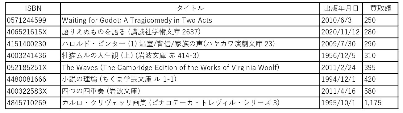 下は今回の買取品のうち、250円以上の買取額をお付けできたものをリスト化した表です。最高額は1冊で1,175円でした。