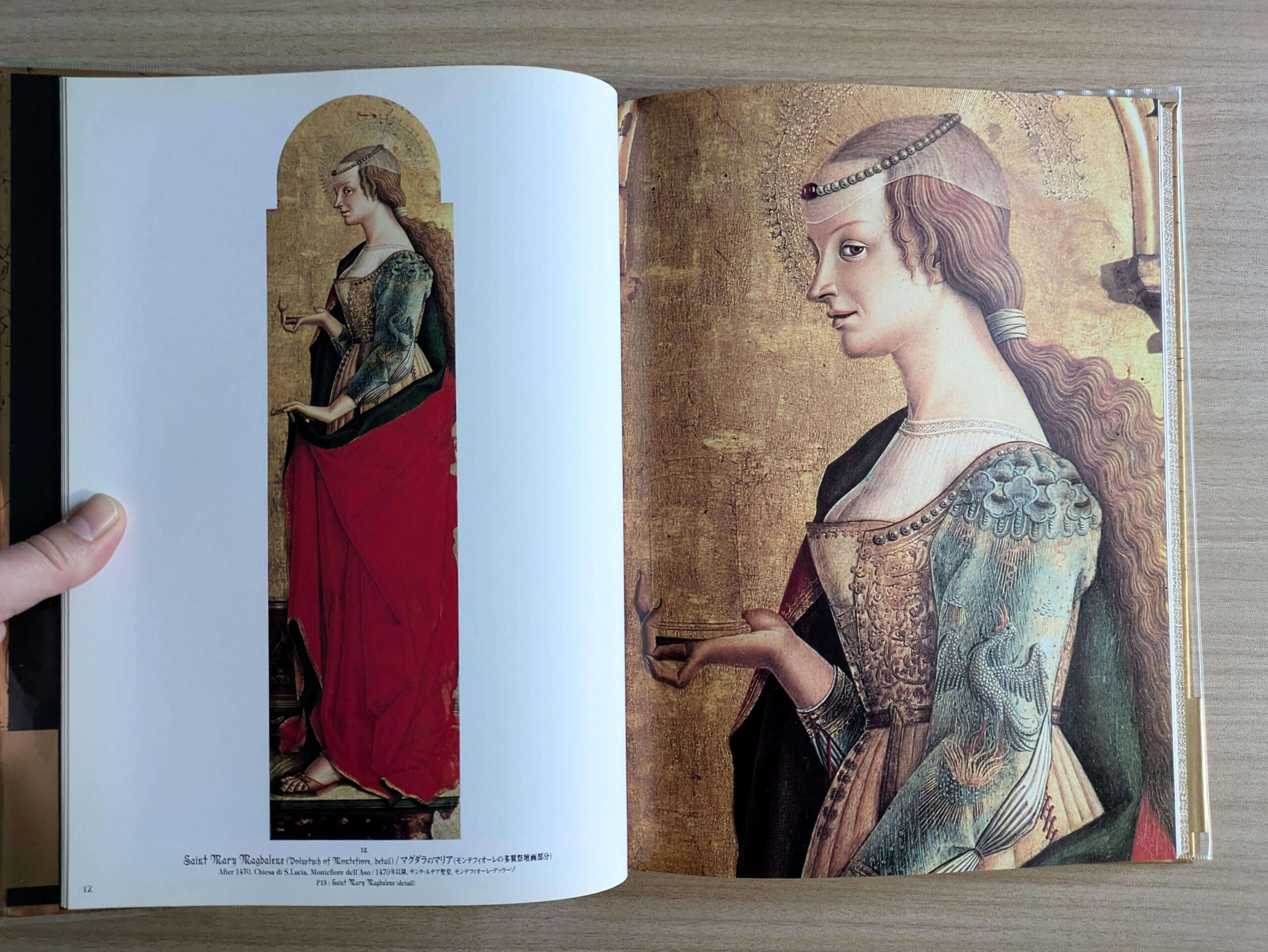 表紙はあの澁澤龍彦が絶賛したマグダラのマリア(アムステルダムの王立美術館所蔵、1475年頃)です。紙面にも別のマグダラのマリア(モンテフィオーレ・デッラーゾというイタリアの小村の聖堂に飾られている多翼祭壇画部分。下画像)が紹介されていますが、私はこちらの方が好みです。