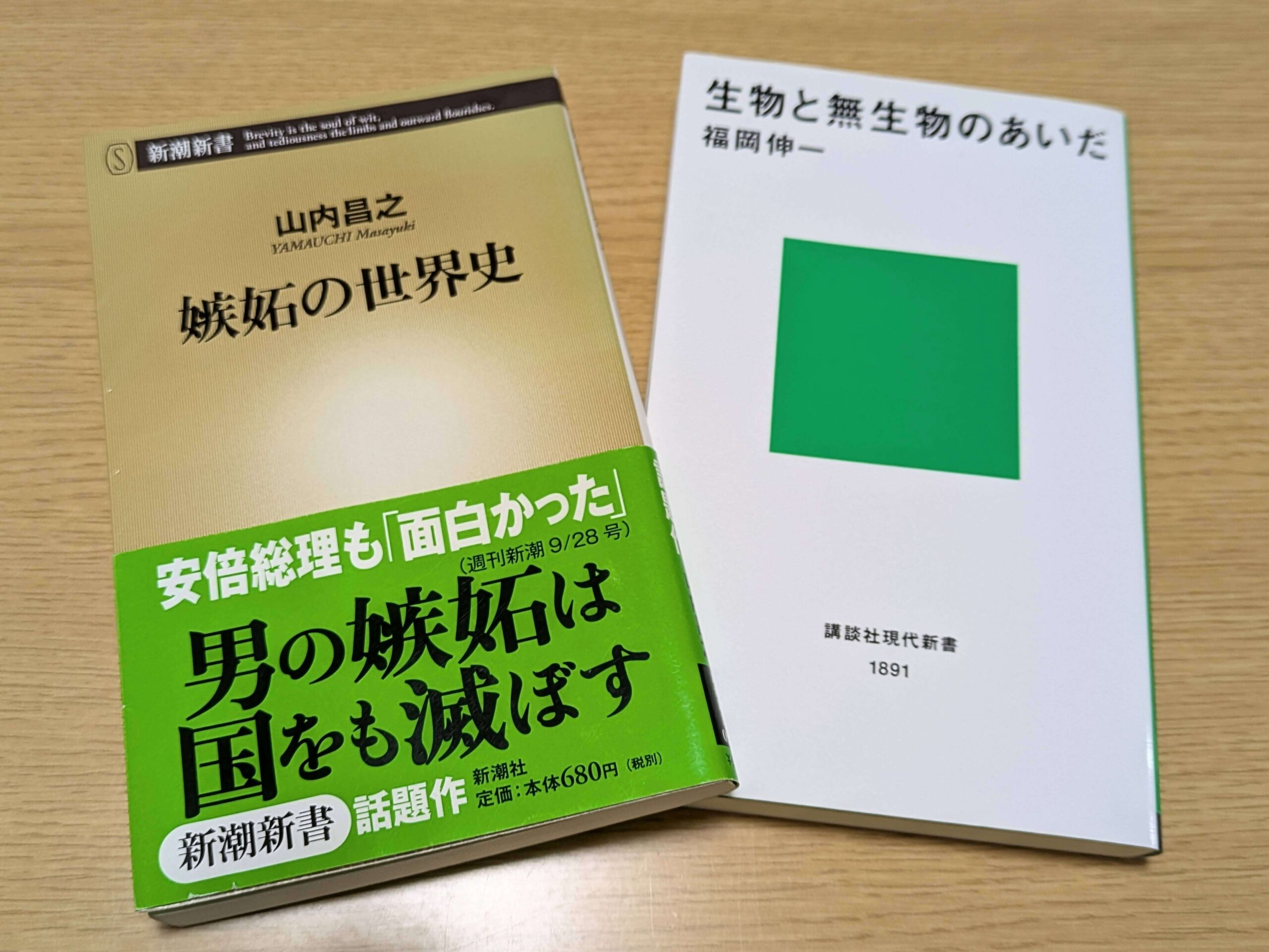 上の画像はたまたま自宅本棚にあった『嫉妬の世界史』 (山内昌之、2004年、新潮社)と『生物と無生物のあいだ』(福岡伸一、2007、講談社)。前者は「波」に掲載されたエッセイ「男の嫉妬」が単行本化のきっかけでした。そして、後者は「本」連載からの単行本化です。