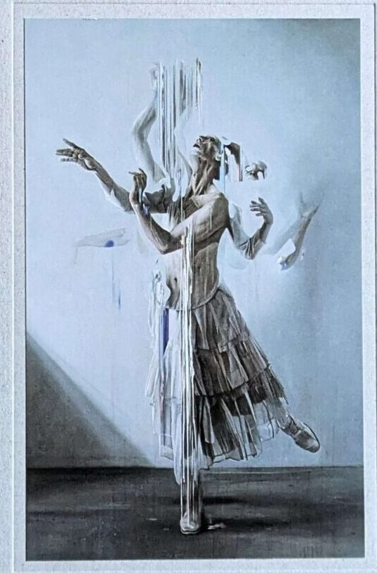 この作品は、20世紀のスペイン舞踊の革新者であるラ・アルヘンチーナ・アントニア・メルセを讃え、大野一雄が創作した作品「ラ・アルヘンチーナ頌」を川口氏が踊っている場面を描いたものです。川口の耳から後頭部にかけた部分に目を凝らすと、メルセと思われる女性像が浮かび上がっているのがお分かりいただけるでしょう。