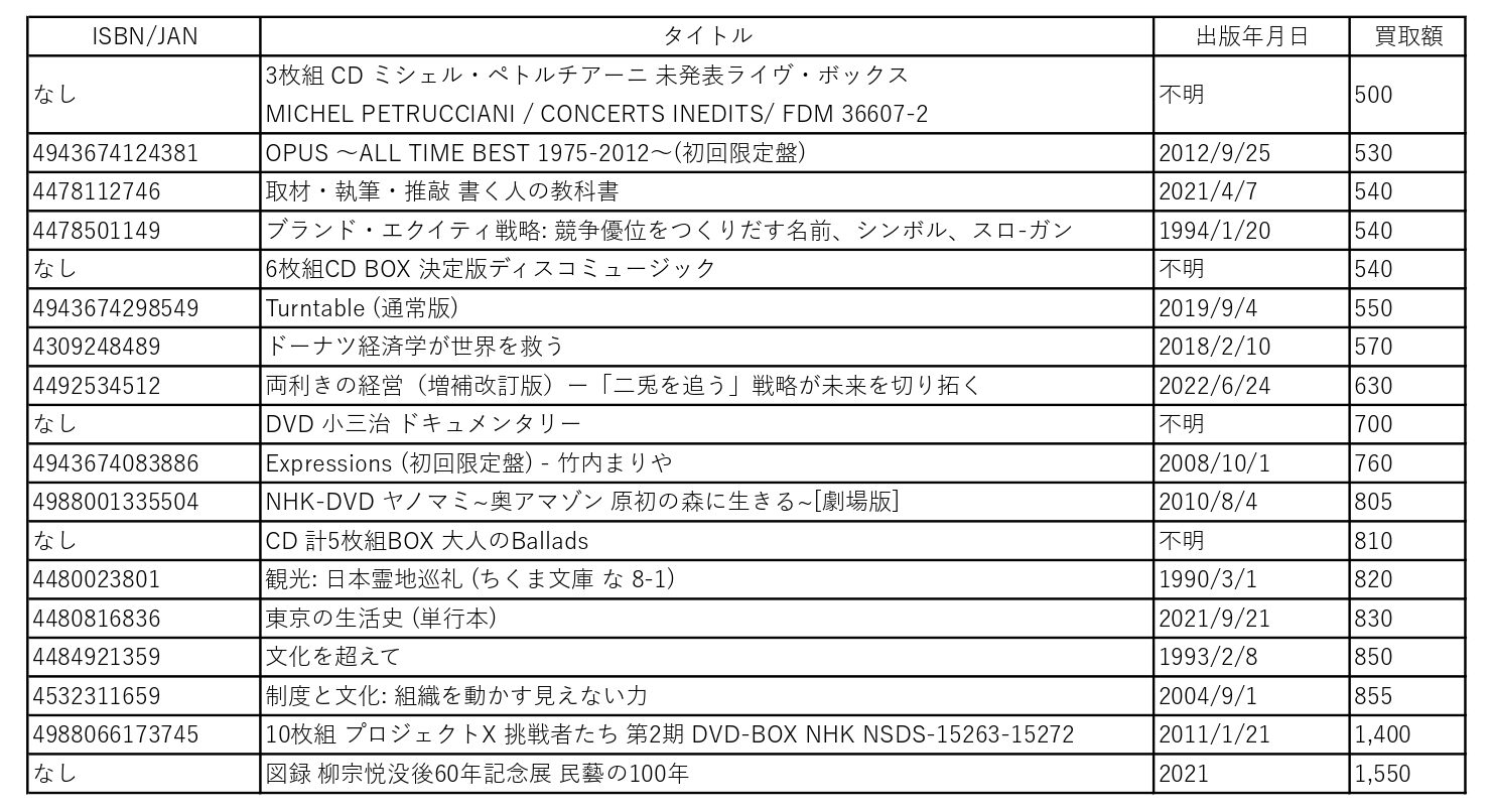 下表のような商品に500円以上の買取額をつけることができました。以前の記事にも登場したことがありますが、最高額の『図録 柳宗悦没後60年記念展 民藝の100年』は相変わらず人気です。それゆえ、買取額も高めについております。
