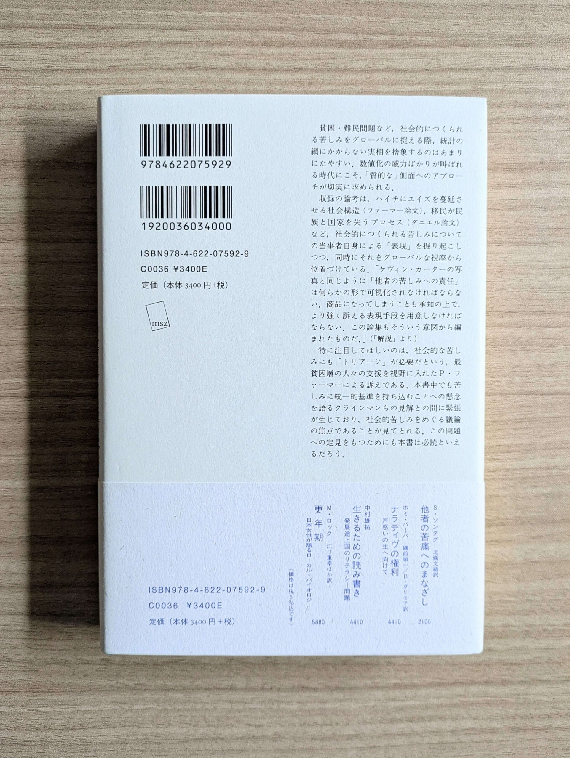 本書タイトルは『他者の苦しみへの責任』ですが、原題はシンプルに「Social Suffering」で、直訳すると「社会的苦しみ」です。邦訳版でわざわざ「責任」という言葉が用いられたのは、まさに「他者の苦しみに目を向けよ、そして不感症から脱して自分事として考えよ」というメッセージだと、私は受け止めました。