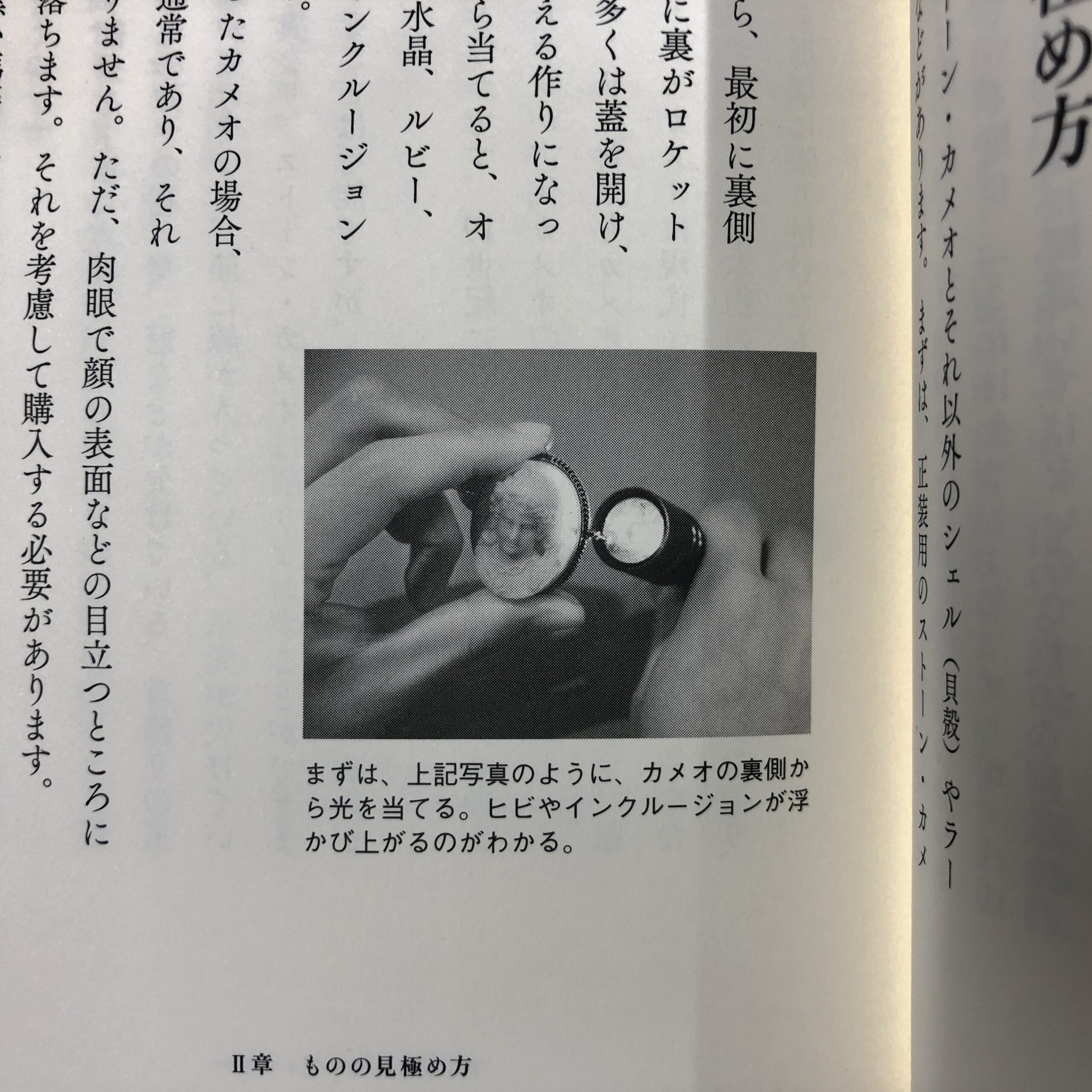 石製カメオと貝製カメオの見るべき場所の違いから、ジュエリーごとの見極め方、象牙と骨製品の見分け方などなど。見ているだけで大変興味深いです。
