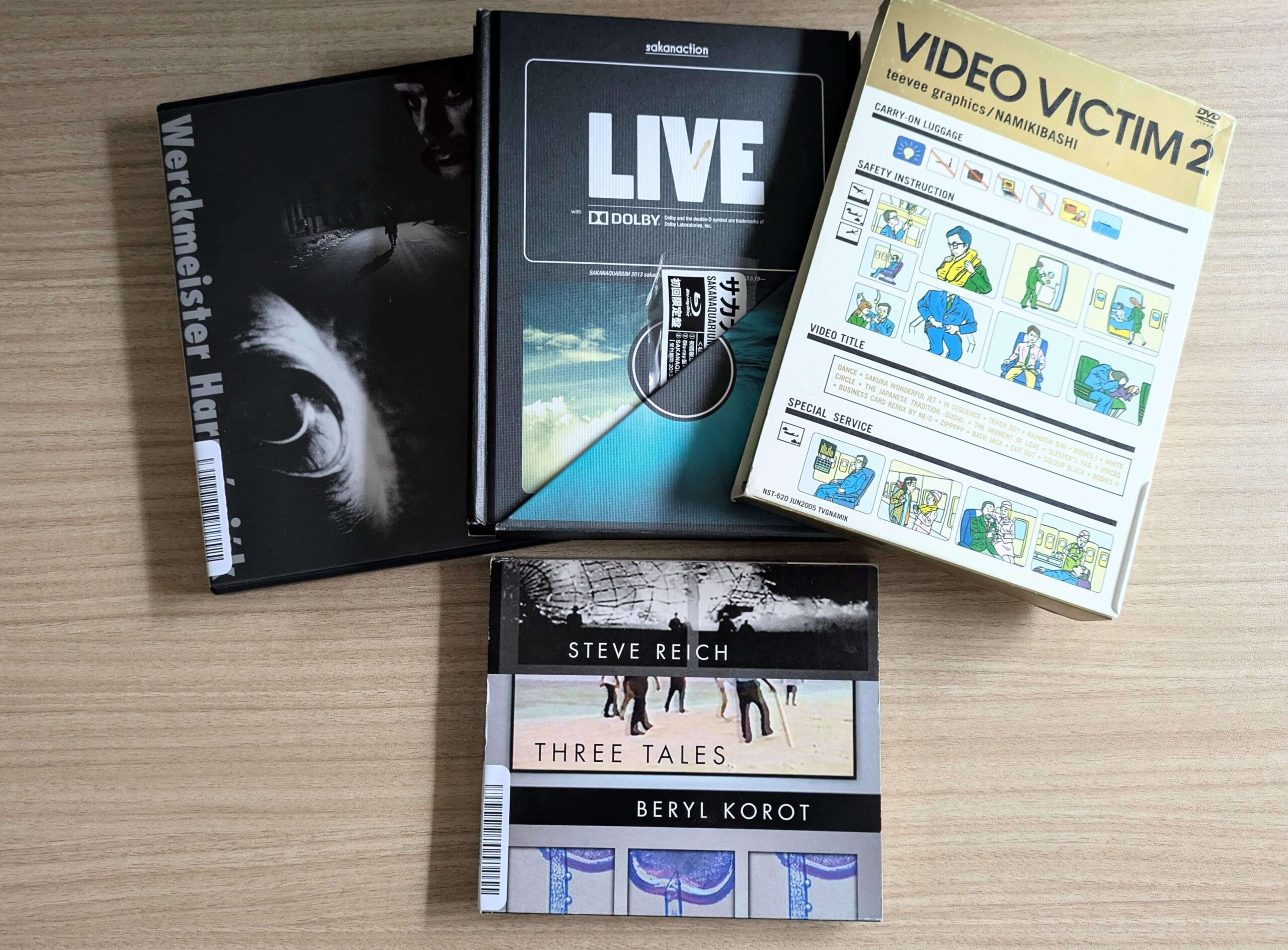 また、下から3番目は映画のDVDです。監督は1994年の7時間18分にも及ぶ超長尺作品『サンタンゴ』で話題となっていたタル・ベーラ。この『ヴェルクマイスター・ハーモニー』は上映時間だけ見れば2時間強と一般的な作品なのですが、使用カット数が37しかないというクセ強な撮り方をしているという意味で、やはり異常な作品ですね…。
