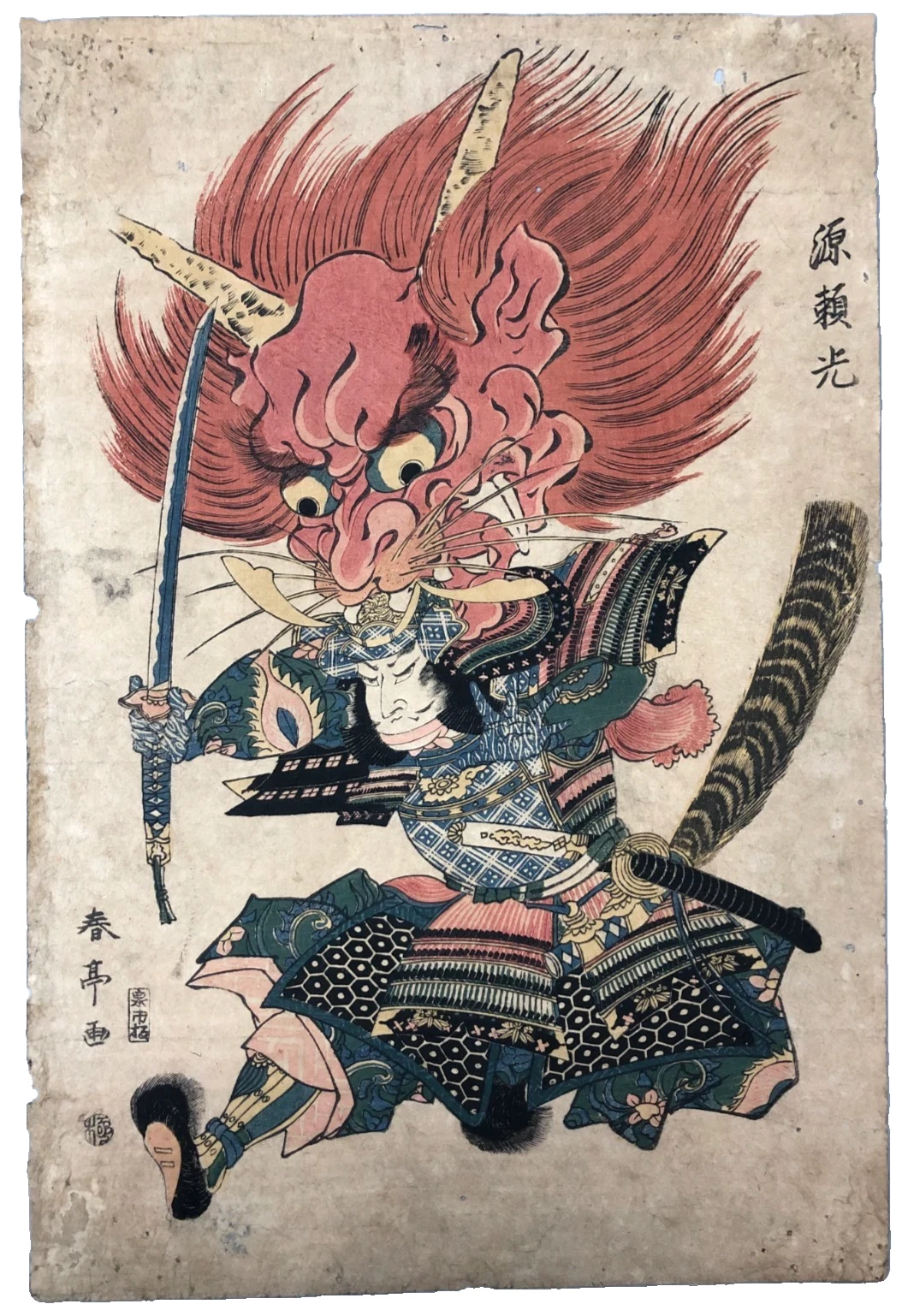源頼光(948–1021)は平安時代の武将で、日本の伝説や軍記物語に登場する「鬼退治の英雄」として知られています。本作では、頼光の背後に巨大な鬼の顔が描かれており、迫力ある鬼退治の場面を表現しています。