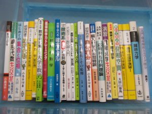 今回は数学・物理学などを中心に60点程の買取をさせていただきました。 「線形代数学(新装版)」「高校‐大学 数学公式集:第II部 大学の数学」「演習力学 ...