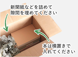 古本を送る際には、古本は横置きで梱包して下さい。すき間があいた時は、新聞紙等の緩衝材で隙間を詰めてください。